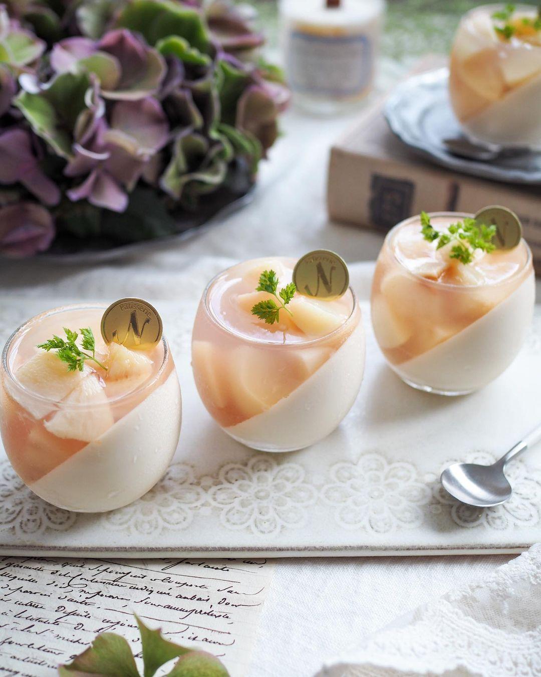 贅沢にカットされた桃がたっぷり入ったグラススイーツ😊 美味しそうすぎて今すぐ食べたいな~。。。
